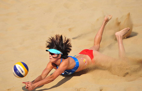 Chinese pair Xue Chen and Zhang Xi beat Karla Borge and Britta Buthe of Germany 18-21, 21-17, 21-19 in a nail-biting final to win the women's title at the beach volleyball world championships on Saturday.
