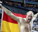 Germany's Robert Harting threw a massive personal best with his final attempt to take the men's world discus gold on Wednesday as the Olympic stadium erupted in a deafening chorus of cheers.