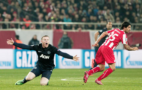 Olympiakos Piraeus made it fifth time lucky on Tuesday, sweeping past an abject Manchester United team 2-0 in their Champions League last-16 first leg at the Georgios Karaiskakis Stadium.