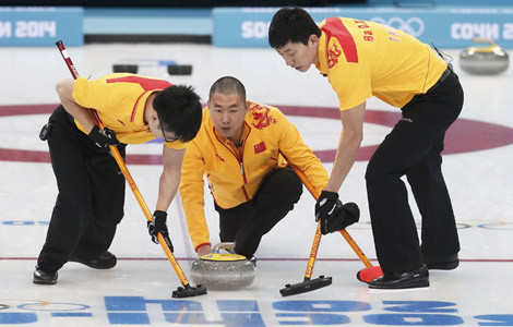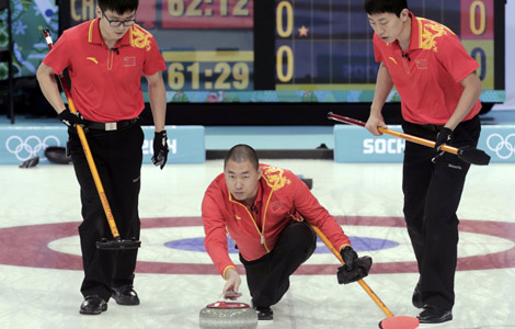 The Chinese men's curling team beat Denmark 7-4 to win their first match at the Sochi Winter Olympic Games in the Ice Cube Curling Center in Sochi on Monday.