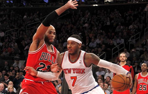 Carmelo Anthony worked with Amar’e Stoudemire to contribute 44 points, finally leading the New York Knicks to an 83-78 victory at home after smashing down the visiting Chicago Bulls’ rebounding from a 24-point deficit.