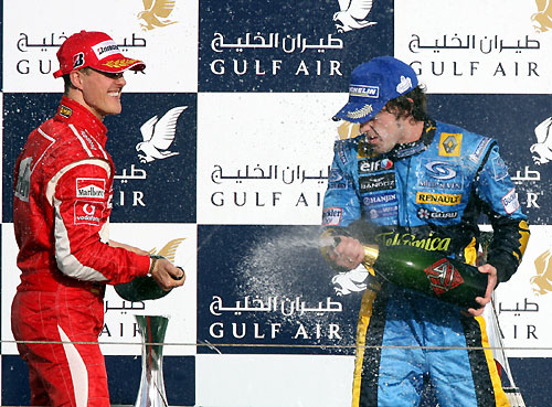 Ferrari's Michael Schumacher of Germany leads teammate Felipe Massa of Brazil around a turn during the qualifying session of the Malaysian Formula One Grand Prix Saturday, March 18, 2006 in Sepang, Malaysia. Schumacher missed a chance to beat the all-time record which he shares with Ayrton Senna for most pole positions. [AP]