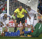 Slovakia's goalkeeper Jan Mucha holds on to the ball inside his goal after a struggle with Italy's Fabio Quagliarella.