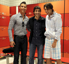 Real Madrid players Cristiano Ronaldo and Raul Gonzalez pose with tennis player Rafael Nadal inside the dressing room during the Madrid Open tennis tournament.