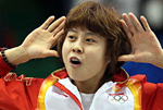 China's former Olympic swimming gold medalist Luo Xuejuan reacts as she watches swimming games during the 14th FINA World championships at the Oriental Sports Center in Shanghai.
