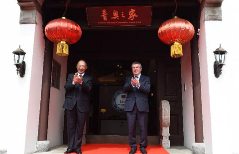 The president of International Olympic Committee Thomas Bach (r) and the president of Chinese Olympic Committee Liu Peng attend the unveiling ceremony of the Chinese Olympic Committee Youth Club in Nanjing, capital of east China’s Jiangsu Province, Aug. 16, 2014.