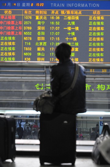 A man looks up at a train information board at Guangzhou Railway Station in Guangzhou, south China's Guangdong province January 4, 2009. Guangzhou Railway Station has seen a sharp rise in the number of travellers since the New Year holiday started on January 1. [Xinhua]