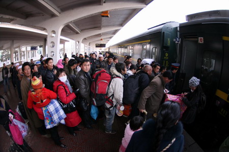 Travellers queue up to board a train heading for Tibet at Xining Railway Station in Xining, northwest China's Qinghai province January 4, 2009. An early travel rush with travellers mainly migrant workers and college students return home for Spring Festival holiday. [Xinhua]