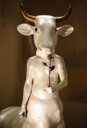 Updated: 2009-01-08 21:05 An art piece, shaped as an ox, titled "Bull Man's Love" is displayed during the Cow Parade exhibition as part of the upcoming Chinese Lunar New Year of the Ox celebrations in Taipei January 8, 2009. [Agencies]