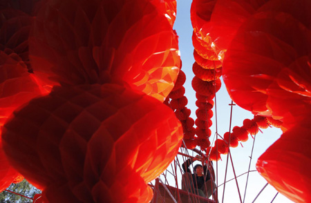 A worker prepares red lantern decorations at a park in Beijing January 12, 2009. Red decorations are customarily used by Chinese people all over the world to usher in the Lunar New Year on January 26, 2009, which is the Year of the Ox. [Agencies]