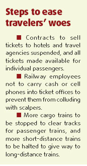 The instruction, posted on the ministry's website yesterday, drew applause from the public. "It shows the leaders are trying to solve people's problems," wrote a netizen from Hunan province. After Hu's instruction, the first by a top leader, the ministry called a press conference to announce a series of measures to resolve the ticket issue. They include suspending contracts to sell tickets to hotels and travel agencies, and putting all tickets on sale for individual passengers, Vice-Minister of Railways Wang Zhiguo said.