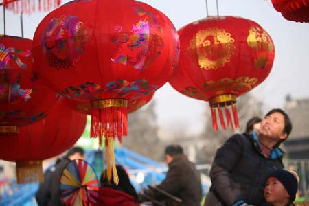 People select Spring Festival lanterns in a street in Mengcheng County, east China's Anhui Province, January 18 2009, a week ahead of the traditional Spring Festival. Xiaonian, or Minor New Year, is the twenty-third day of the last month on the Chinese lunar calendar. On this day, Chinese worship the Kitchen God, who looks after a family's fortunes, for blessings in the next year. [Xinhua]
