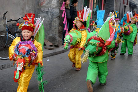 Kids walk in a street during a rehearsal of Shehuo, a traditional outdoor variety show, in Pingyao, north China's Shanxi Province, January 17, 2009. [Agencies]