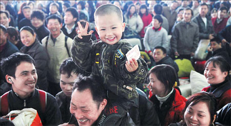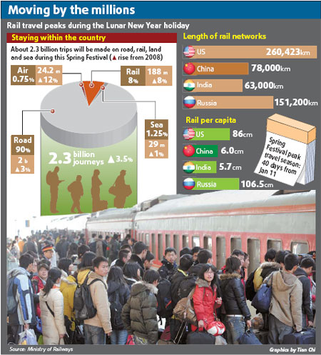 But for the first two days, the 51-year-old migrant worker for a house decoration firm returned to his small rented room, with no ticket in his pockets and an empty stomach to boot. On day three, faced with dwindling options and the possibility of ushering in the Lunar New Year in Beijing without his wife and son, Lu resorted to buying a hard seat or third-class ticket on a slow train. "A fast train would take me home in 14 hours. But I'm not so sure about this one these slow trains stop at almost every train station," Lu said. Many would agree Lu has reason to be worried. Riding on a slow train during peak travel seasons in the country can be daunting, as one online user recently posted on his blog: "You won't want to ride on a slow train again the carriage is left with only standing room at best. Passengers will occupy every space - the aisles, toilets and even the floor space under seats. You better prepare diapers to answer nature's call." From the near impossibility of getting a ticket on time to a fearsome train ride, these are experiences numerous Chinese countrywide would have had one way or another. Come Spring Festival, when millions of Chinese throughout the country ready to head home for the all-important family reunion on the economical transport provided by trains, and the situation at railways hogs the headlines. Trains during the Lunar New Year travel season, which starts on Jan 11 this year, can expect to carry six million passengers at most daily, up to twice that of a usual day operating under normal situations, said Beijing Jiaotong University professor Yang Hao.