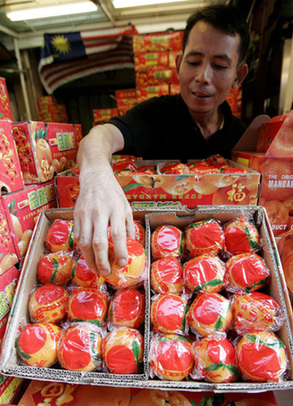 A shopkeeper arranges oranges at a stall in Kuala Lumpur's Chinatown January 20, 2009. Some shoppers have cut back on buying foodstuffs and decorative items for the Chinese New Year festival this year in order to maintain the same amount of money given out in "red envelopes", or hong baos, as last year. In Chinese society, hong baos are typically given on the first day of the Lunar New Year by those who are married to those unmarried, regardless of age, for good luck. [Agencies]