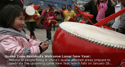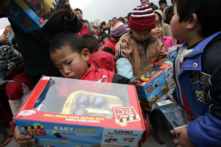 ![]() Children in Yingxiu County, Sichuan Province, receive toys as lunar new year gifts from Dongguan of South China's Guangdong Province, January 22, 2009. Millions of people living in areas hit by the magnitude-8.0 earthquake in May make preparations for the upcoming Lunar New Year, which falls on January 26. [CFP] ![]() ![]() ![]() |