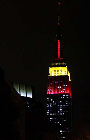 Updated: 2009-01-24 15:58 The Empire State Building is lit up in red and yellow during the night to celebrate the upcoming lunar new year, which falls on January 26, New York city, the United States, January 23, 2009. [Xinhua] ![]() ![]() ![]() |