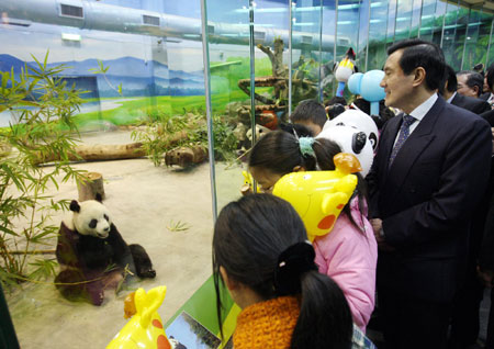 Taiwan leader Ma Ying-jeou is accompanied by children as they look at Tuan Tuan and Yuan Yuan, the two giant panda gifts from the Chinese mainland at the Taipei City Zoo in Muzha January 24, 2009. Around 500 orphans and children from poor families were granted a preview of the panda pair after an inauguration ceremony. The pandas are scheduled to meet the Taiwan public on January 26, the first day of the Chinese Lunar New Year of 2009. [Xinhua]