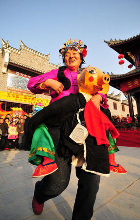 ![]() Folk artist performs traditional dance, celebrating the upcoming Chinese Lunar New Year of Ox in Xixian county, east China's Anhui province Saturday, January 24, 2009. [Xinhua]