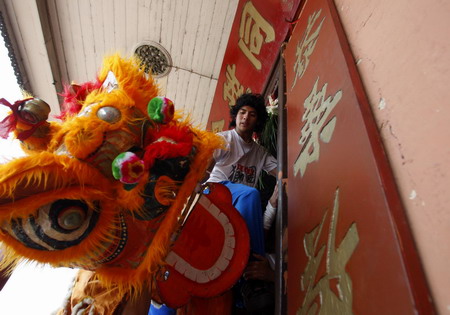 ![]() A performer reaches for the "lion's" head during a lion dance to celebrate the Chinese New Year in Lima's Chinatown January 24, 2009. Feeding and touching the lion is a sign of luck and fortune for the new year according to descendants of Chinese immigrants. [Agencies]