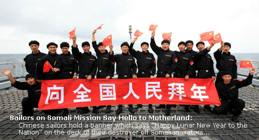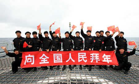 Chinese naval soldiers hold a banner which says "Happy Lunar New Year to the Nation" on the deck of their destroyer January 23, 2009. The Chinese naval vessels have so far carried out six escort missions for 16 ships in the pirate-ridden waters off Somalian coast. [CFP]