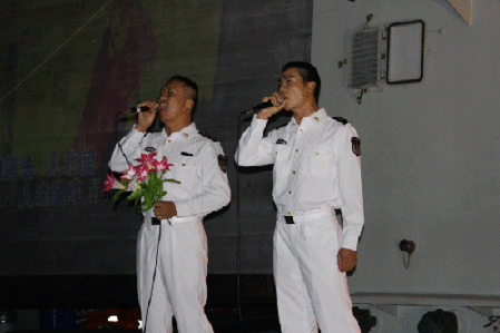Two Chinese naval soldiers sing a song during a Lunar New Year party on the deck of destroyer Haikou, which is on escort mission around pirate-ridden Somalian waters. The Chinese naval vessels have so far carried out six escort missions for 16 ships off Somalian coast. [chinadaily.com.cn/Wang Hui]