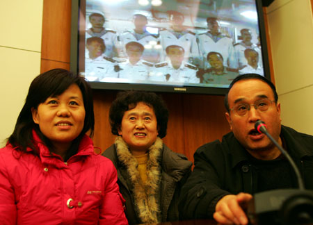 Wang Ying (L), sister of China Daily reporter Wang Hui who is on Destroyer Haikou for escort mission off Somalian waters, talks to her brother with parents of his girl friend via video conference in Beijing, January 26, 2009, the Chinese Lunar New Year's Day. [China Daily/Zhang Wei]