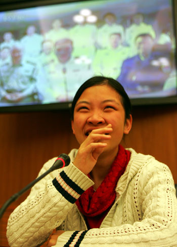 Fu Ruolan, daughter of Fu Xiaodong, vice-president of a naval court who is on Destroyer Haikou for escort mission off Somalian waters, talks to her father via video conference in Beijing, January 26, 2009, the Chinese Lunar New Year's Day. [China Daily/Zhang Wei]