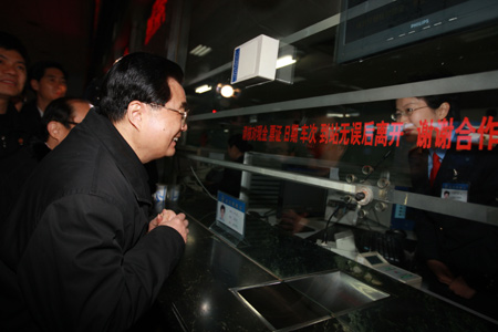 Chinese President Hu Jintao (Front) talks with a clerk to check whether travelers have difficulties in buying tickets at the Nanchang Railway Station in Nanchang, capital of east China's Jiangxi Province, Jan. 26, 2009. [Xinhua]