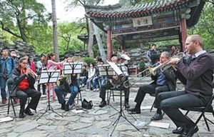 On a Monday afternoon at Fragrant Hills (Xiangshan), tourists unexpectedly met a brass quintet playing Bach and Brahms.
