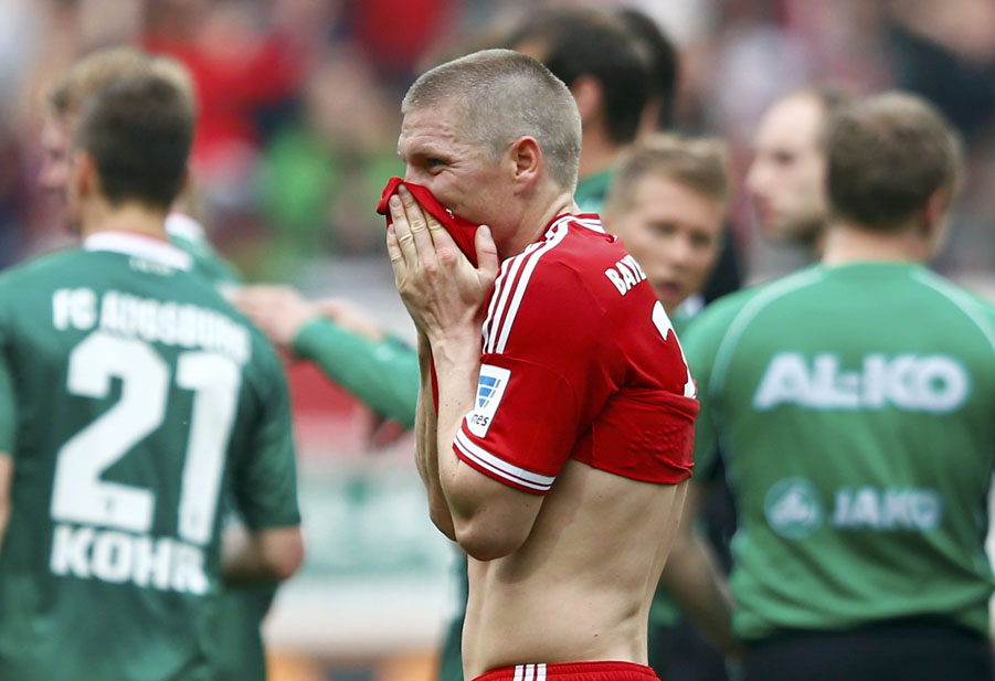 Bayern Munich's Bastian Schweinsteiger reacts after their German first division Bundesliga soccer match in Augsburg April 5, 2014. [Photo/Agencies] GERMANY Bayern Munich's record 53-game unbeaten run in the Bundesliga ended with a 1-0 loss to Augsburg, as coach Pep Guardiola fielded a weakened lineup having seen his team already clinch the title last month. Sascha Moelders scored the goal that handed Bayern its first league loss since a 2-1 defeat at home to Bayer Leverkusen on Oct. 28, 2012. "That's football, that's sport," Guardiola said. "You can't always win. There was going to be a loss sooner or later." Guardiola's priority is the second leg of the Champions league quarterfinals against Manchester United, having drawn 1-1 at Old Trafford. ITALY Inter Milan twice squandered the lead and missed a penalty as its Europa League hopes were dented by a 2-2 draw at home to relegation-threatened Bologna in Serie A. Inter, which was booed off the pitch at halftime and full time, remained fifth but Atalanta can close the gap to one point with a win over Sassuolo on Sunday.