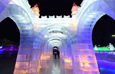 Night view of sculptures at snow expo in NE China