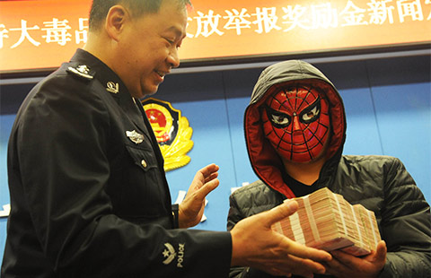 An employee of a freight company wore a Spiderman mask to receive 450,000 yuan ($68,400) reward, the biggest prize of its kind in Guangdong province, on Thursday for tipping off police about a major international drug trafficking ring.