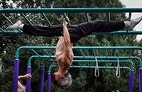 Geng Zhi, one of the seniors, is a 67-years-old retiree who used to work on an assembly line at a car parts factory. He can swing like the Spiderman on a horizontal bar and parallel bars in the park, and then torque his leg behind his head swiftly. "Before this, I didn't exercise at all," Geng said.