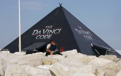 A couple kiss in front of a pyramid advertising The Da Vinci Code as