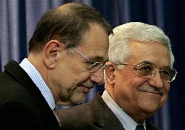 chief Javier Solana (L) and Palestinian President Mahmoud Abbas attend a