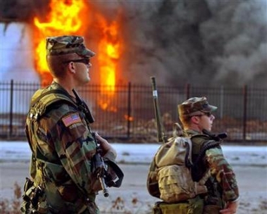 patrol outside a house fire in the aftermath of Hurricane Katrina in New