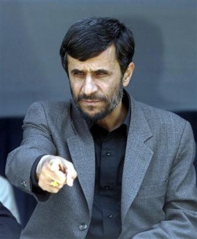 Mahmoud Ahmadinejad points during a public gathering during his visit to