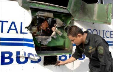 damages caused by a bomb on a bus used as a mobile police outpost in