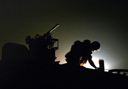 An Israeli soldier atop an Armoured Personnel Carrier (APC) makes last preparations to enter the Gaza Strip in Rafah border crossing area on the Israeli-Gaza border June 28, 2006. [Reuters]