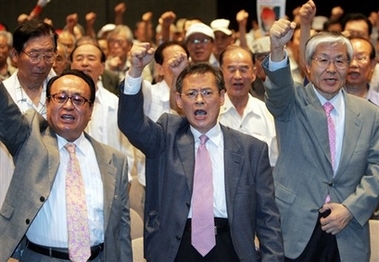 South Koreans shout a