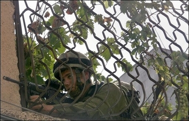 An Israeli soldier takes his position under a vine during a military operation in the Askar refugee camp in the West Bank city of Nablus. Israel has pressed on with its bloody offensive against Gaza a day after reoccupying land and waging multiple air strikes in the deadliest 24 hours in the Palestinian territories for four years. [AFP]