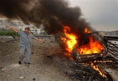 aprroaches a civilian car that was struck on a bridge by an Israeli