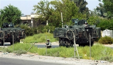 A US soldier stands guard next to US military Stryker vehicles convoy on a main highway, in Baghdad, Iraq, Tuesday, Aug. 8, 2006. Iraq's prime minister sharply criticized a US-Iraqi attack on a Shiite militia stronghold in Baghdad, exposing a rift with his American partners on security tactics, as 24 people were killed Tuesday in a series of bombings and shooting. [AP]
