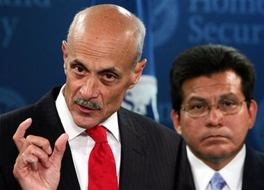 Secretary Michael Chertoff, left, speaks as Attorney General Alberto R.