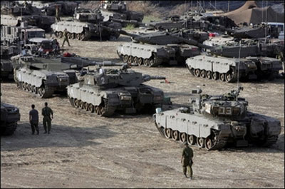 Israeli tanks sit at a staging ground for