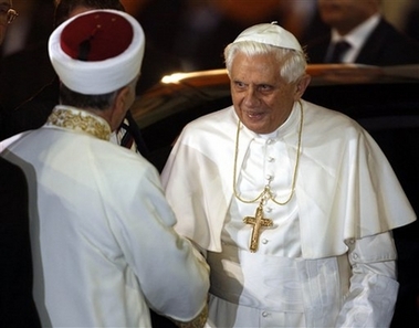 Pope Benedict XVI, right, is greeted by Istanbul's Mufti