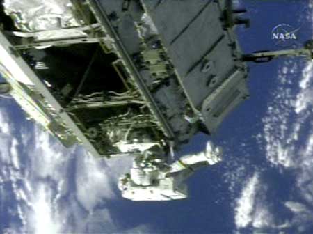 Astronaut Robert Curbeam works at the end of the International Space Station's S1 truss segment December 16, 2006 as he and fellow spacewalker Sunita Williams work outside the orbiting laboratory in this video grab. [Reuters]