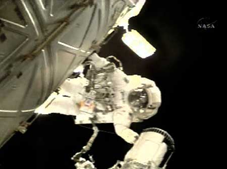 In this image from NASA TV, astronaut Sunita Williams is seen on the outside of the International Space Station with the end of the station's robot arm during her spacewalk December 16, 2006. [Reuters]