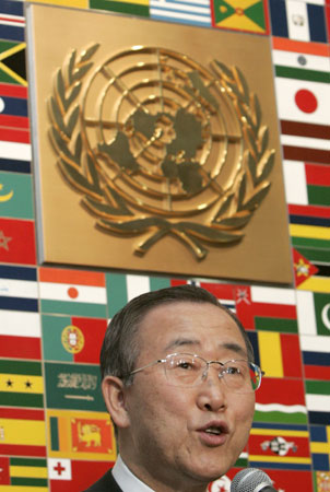The incoming UN Secretary General Ban Ki-moon speaks in front of the monument to celebrate his inauguration to being UN Secretary General at South Korea's Foreign Ministry office in Seoul December 26, 2006. It is not time to give up hope on international talks aimed at ending North Korea's nuclear weapons programme, Ban Ki-moon said on Tuesday. [Reuters]